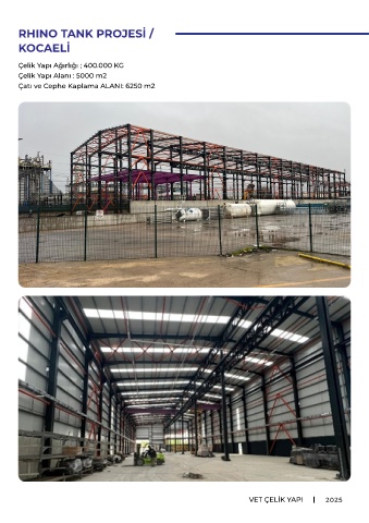 RHINO TANK PROJESİ / KOCAELİ Çel k Yapı Ağırlığı ; 400.000 KG Çel k Yapı Alanı : 5000 m2 Çatı ve Cephe Kaplama ALANI: 6250 m2 VET ÇELİK YAPI 2025